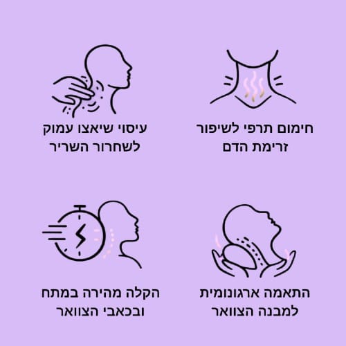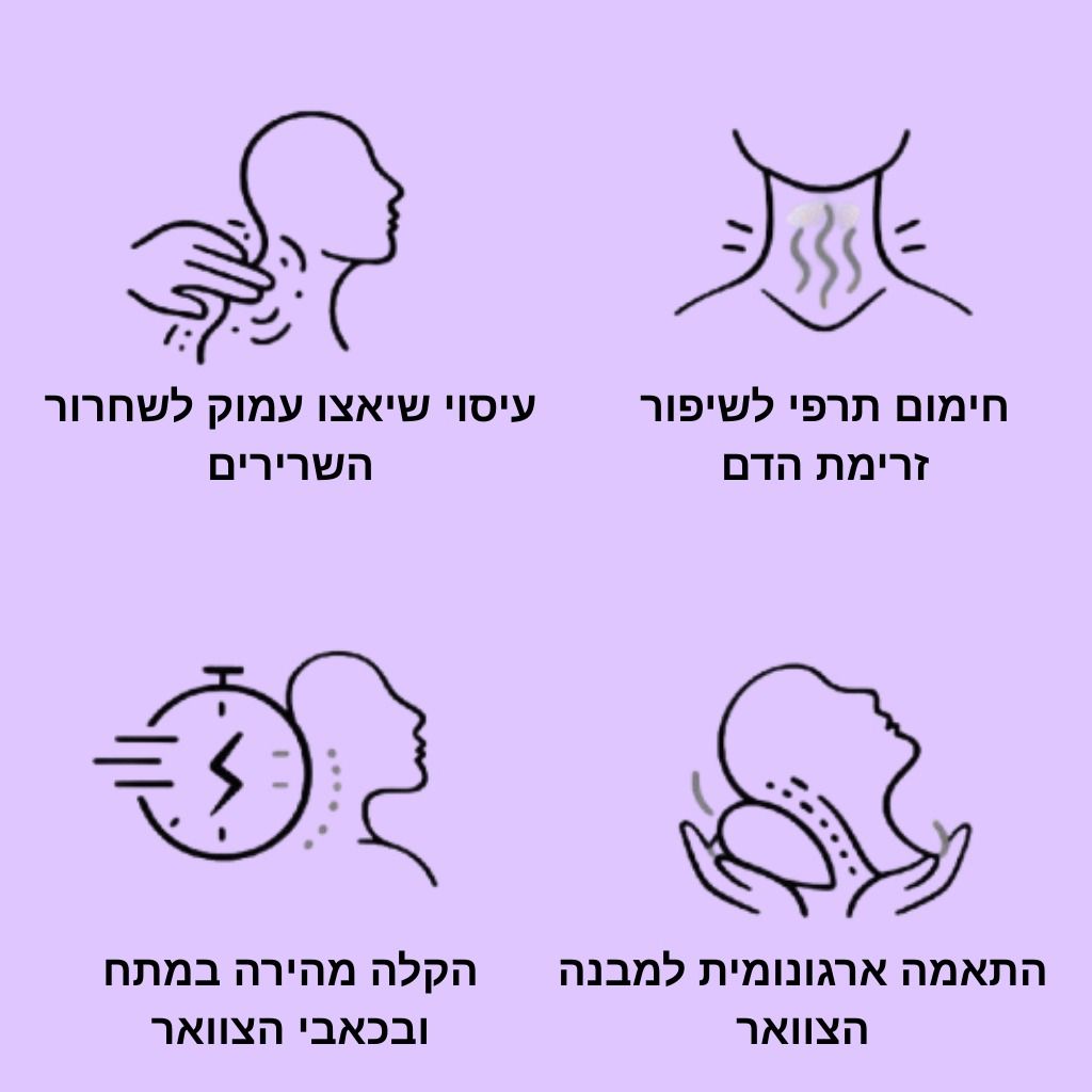 השילוב הזה מאפשר לשרירים להשתחרר בהדרגה ולהעניק תחושת רוגע עמוקה יותר באזור הצוואר.